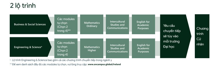 Chương trình Dự bị quốc tế ON CAMPUS IRELAND tại trường sẽ có 2 Lộ trình gồm các modules khác nhau để bạn để sinh viên lựa chọn theo học. Sau khi hoàn thành các học phần, bạn sẽ gửi yêu cầu chuyển tiếp lên trường Đại học và bắt đầu chương trình học Cử nhân.